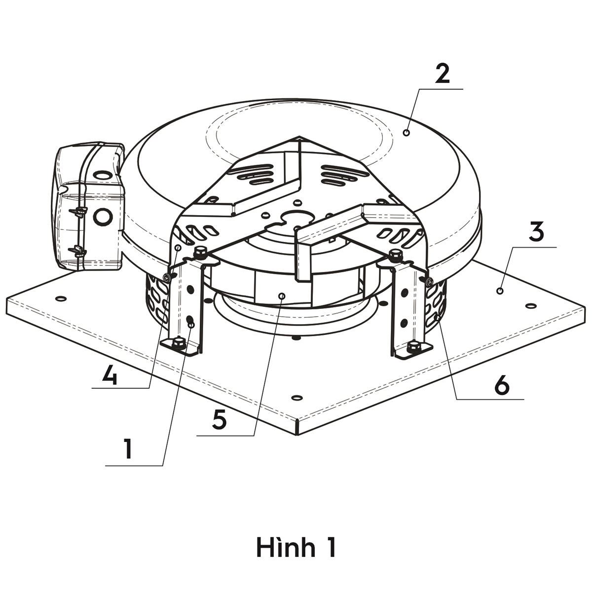 Quạt gồm một vỏ tròn (1) có nắp bảo vệ (2) được gắn trên đế vuông (3).