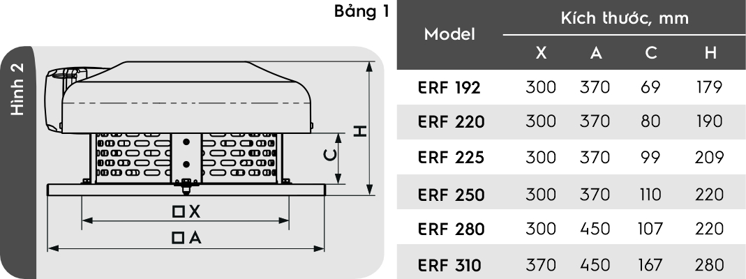 Tên gọi của quạt ERF, hình dáng, kích thước tổng thể và kích thước kết nối được thể hiện trong Hình 2 và Bảng 1.